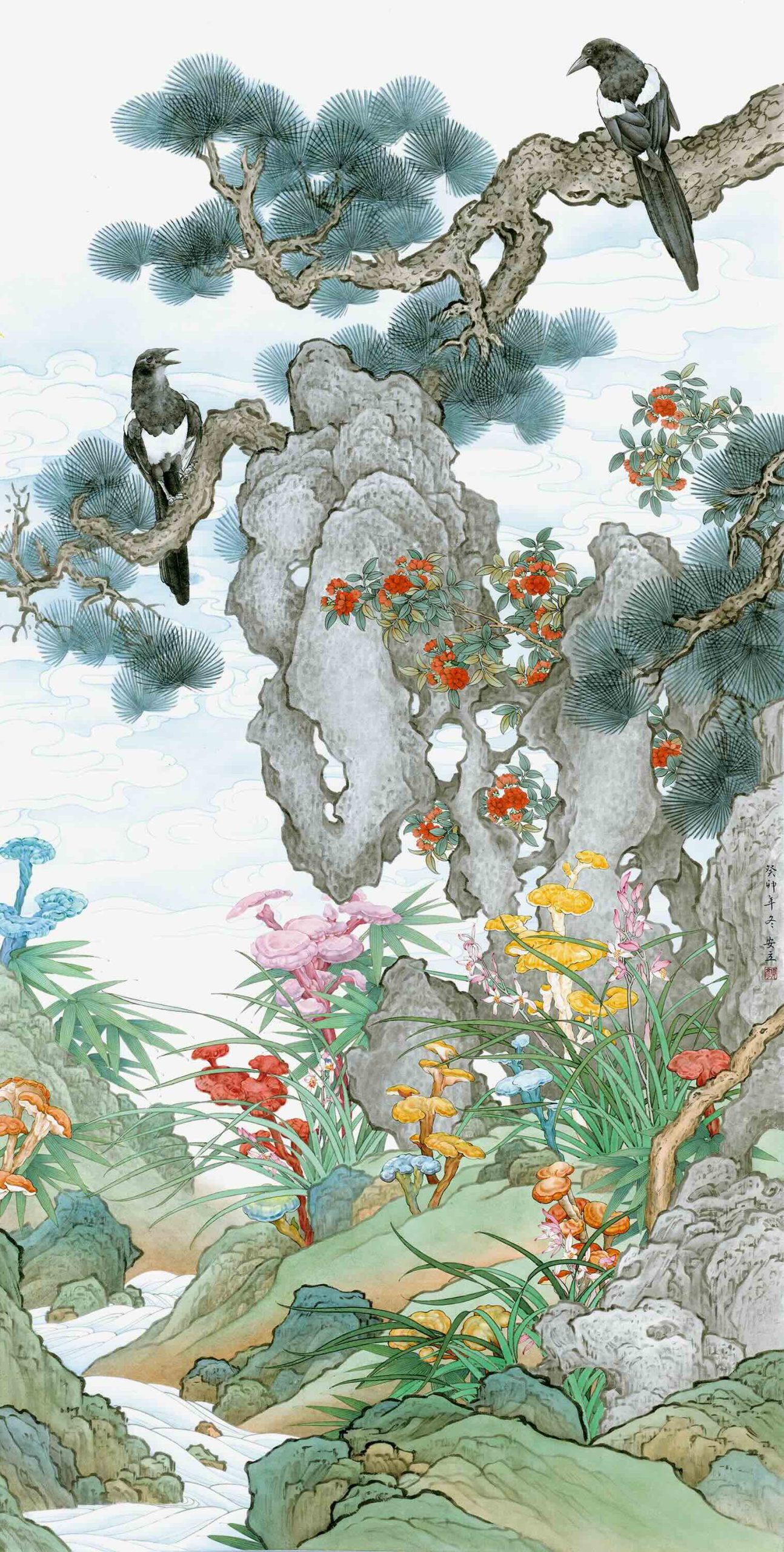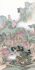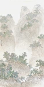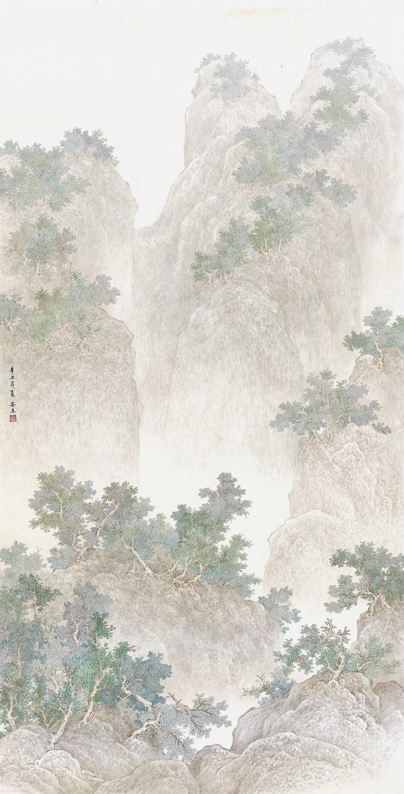 After years of study and rigorous copying of masterworks, Yan has become highly adept at portraying the majestic peaks and dense forests characteristic of Northern Song landscapes. Following in the stylistic footsteps of Lan Ying, she brings vibrant and dreamlike color palettes into cold, layered mountain scenes. Through richly layered hues, she creates a fantastical and visually enchanting atmosphere. Yan has also evolved a distinctive style characterized by delicate ink washes and a soft-focus treatment of air and light—a style she refers to as the “misty body.” While preserving the textural richness of rocks, trees, rippling water, and drifting clouds, she deliberately diminishes ink outlines and instead chooses subtle blue-tea and pale green tones, transforming once imposing landscapes into ethereal realms of lightness and imagination.